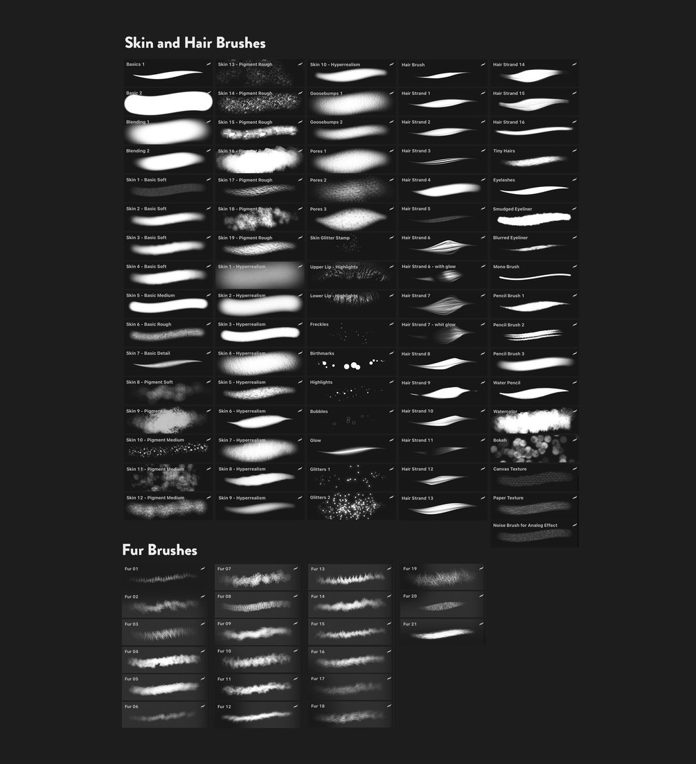 ✓ 20 Hair brushes with single and multiple strands for fast and realistic results.