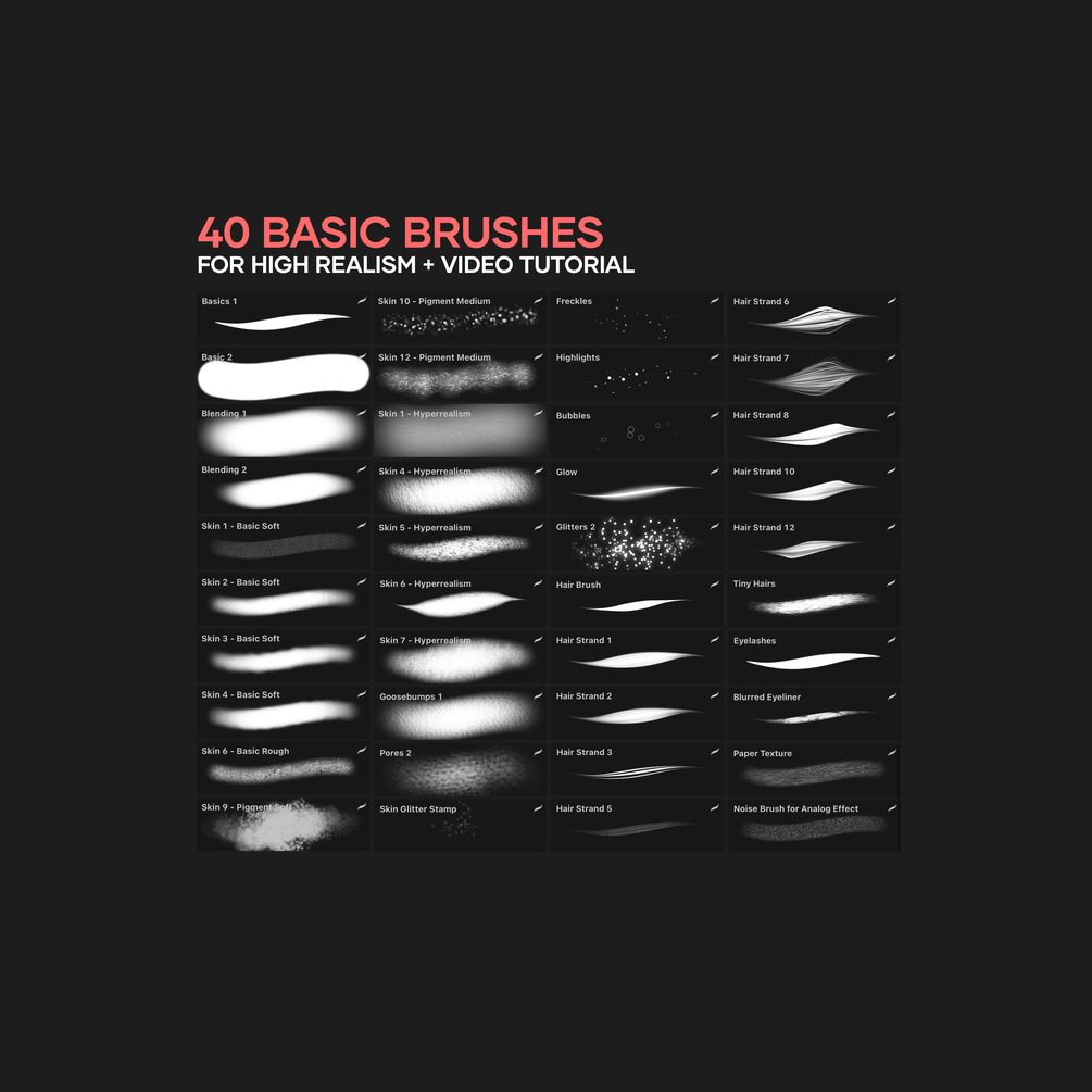 Here you have 40 of my portrait brushes for beginners and pros. Including an additional video tutorial about how I use the brushes to create a realistic looking skin!